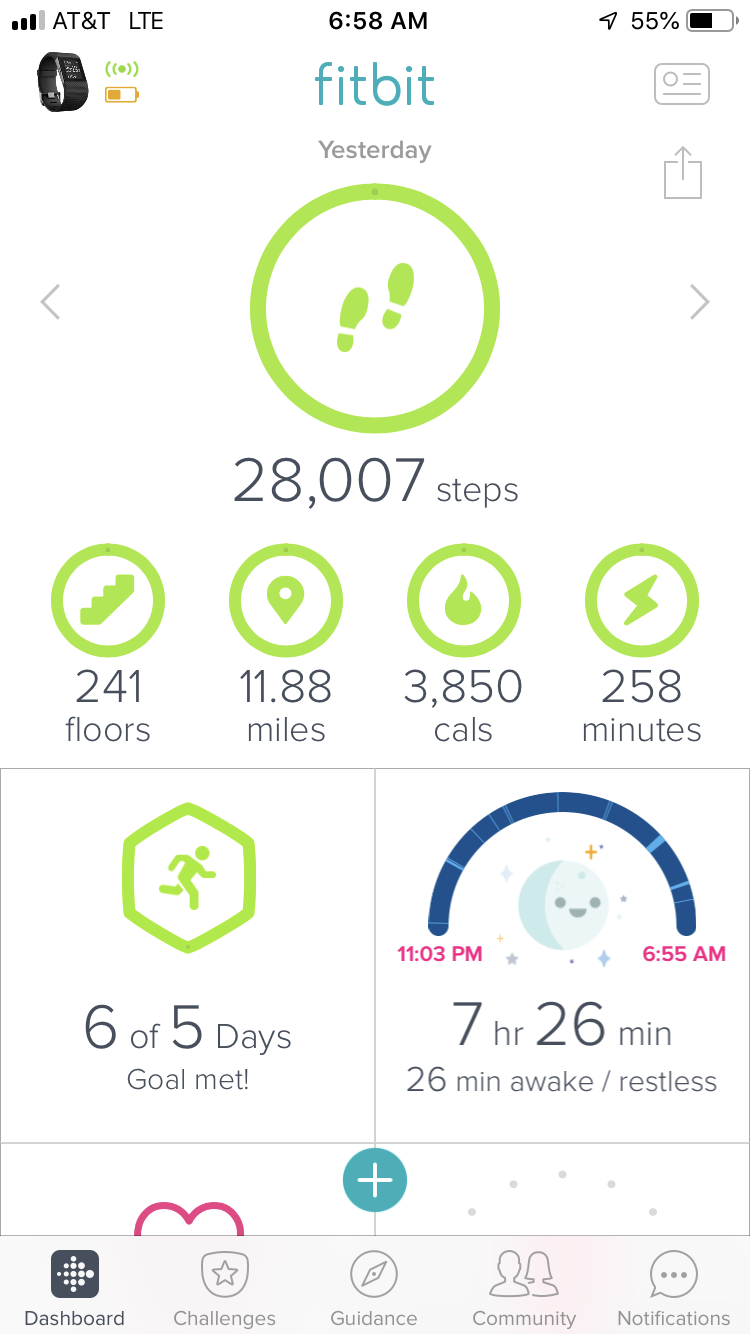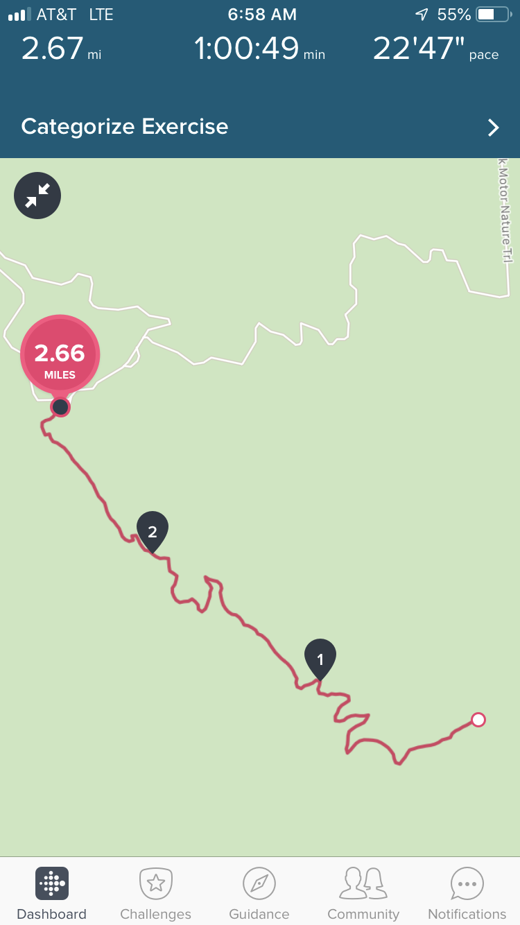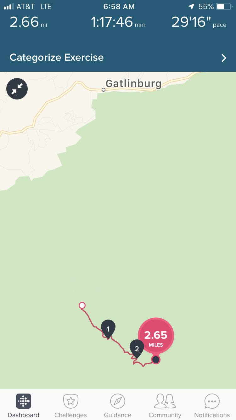 The photo, of course, does not do justice to the size and height of the falls. I took a video as well, but it looks like I’m not able to load that onto this site. Oh well. This was still a nice first trail to complete in the Great Smoky Mountains National Park and an awesome way to see some of the park from the bottom of a valley and then going up a mountain. As you can see below it took us just over an hour to get up to the falls. The way back was much quicker and we were able to shave off 17 minutes of time. These are both screen shots from my Fitbit app.