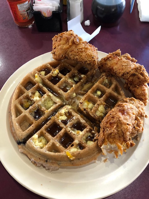 The waffles are always great and they make the best fried chicken I’ve ever had. The yellowish looking stuff on the waffles is peach butter. It may sound weird but it is awesome as well.