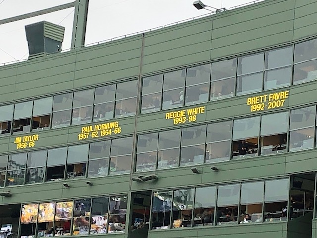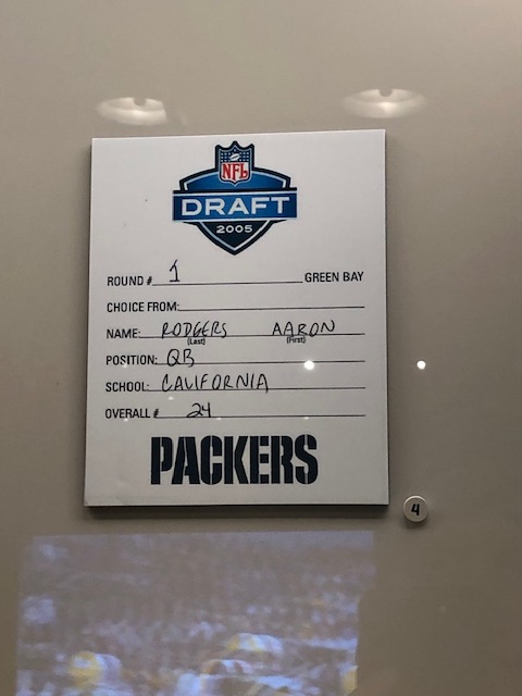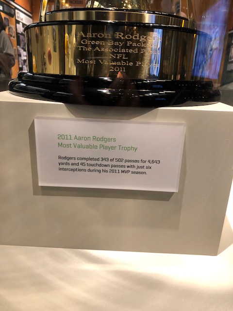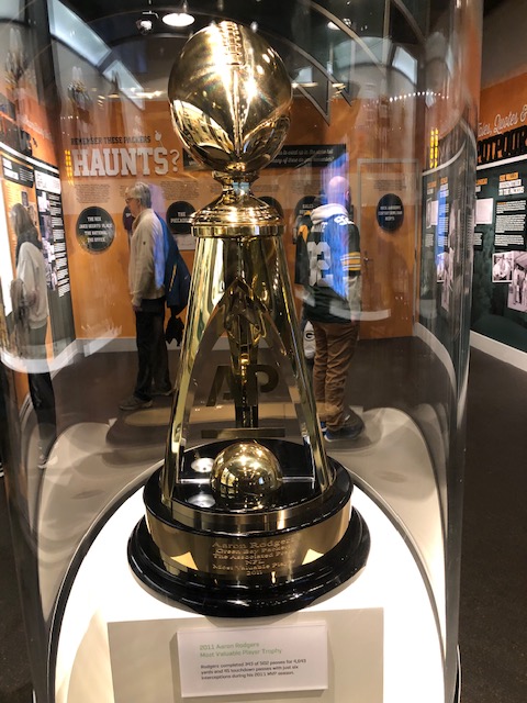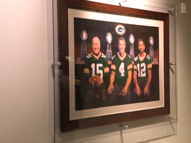 This was the last thing you see when leaving the hall of fame: all three quarterbacks that won the Super Bowl for the Packers. On the left is Bart Starr who won the first two Super Bowls ever played. In the middle is Brett Favre. At the right is Aaron Rodgers.