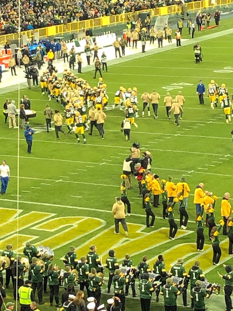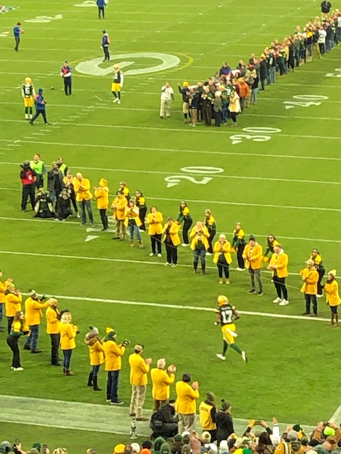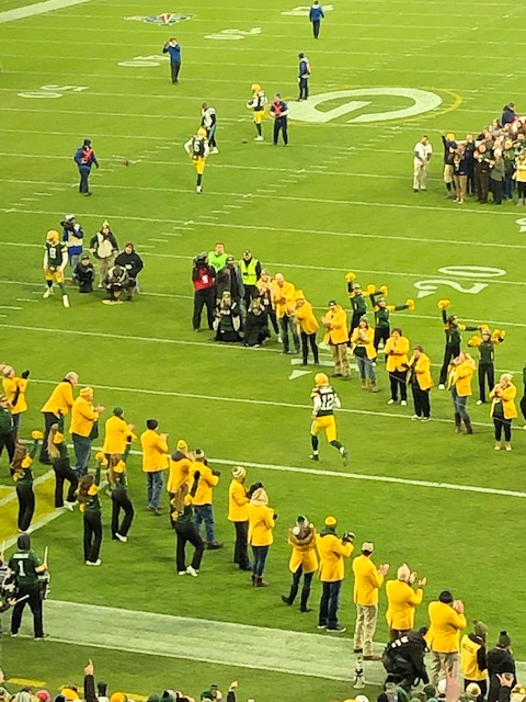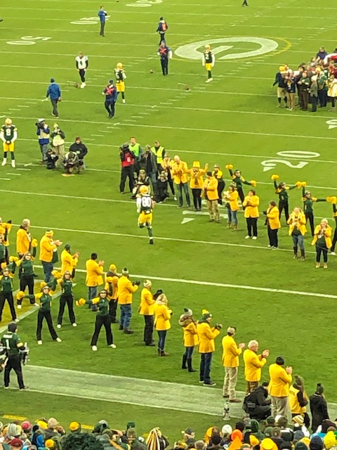 After Aaron Rodgers was introduced he ran through a tunnel created by the rest of the team, giving everyone a low-five along the way. After the low-five the players would sprint out of the lineup. It was a cool thing to watch and I wish I would have recorded it instead of taking some pictures.