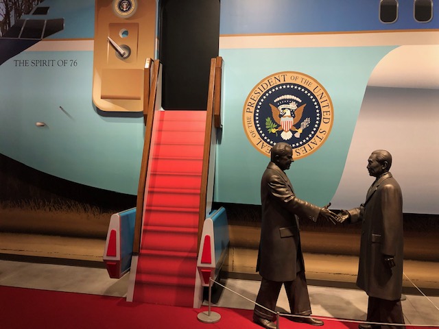 One of the things I took away from the library was that President Nixon was maybe our best foreign policy president. He was the first to visit China and helped to ease the tension between our two countries in a way that only he and his wife, Pat, could. Here he is greeting Chinese Premier Zhou Enlai upon landing in China.