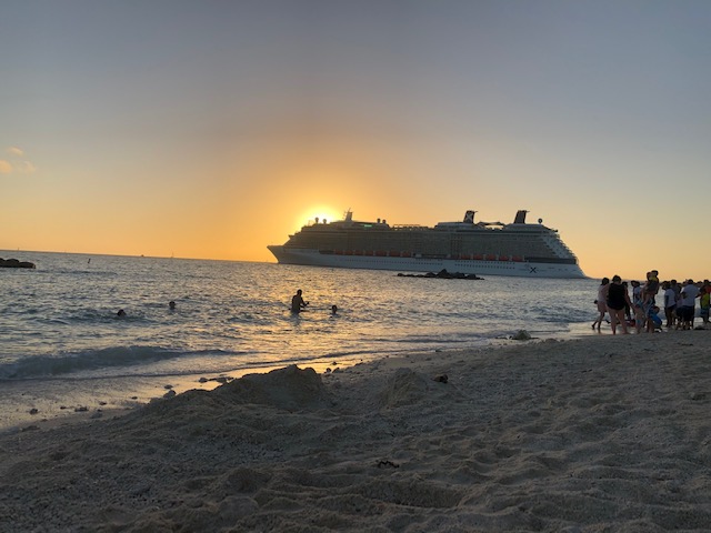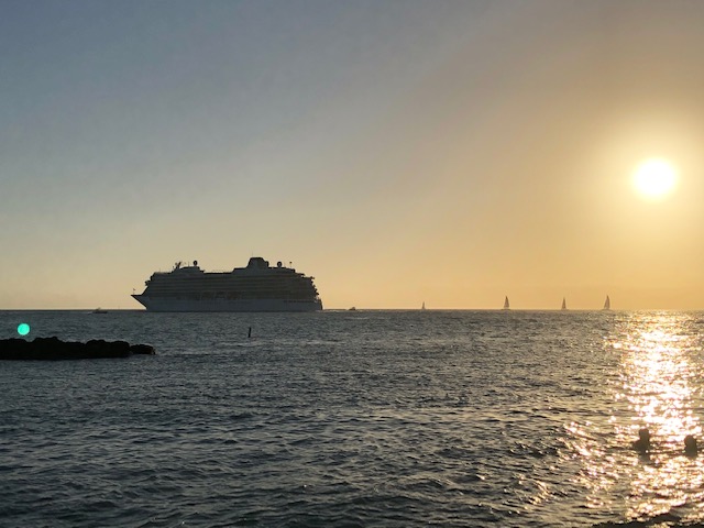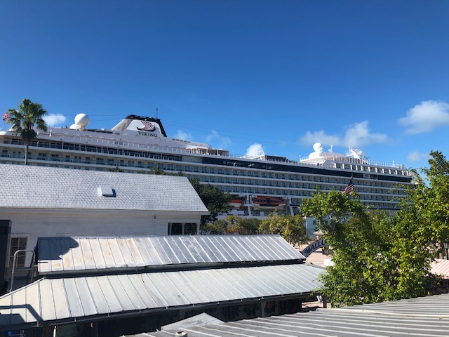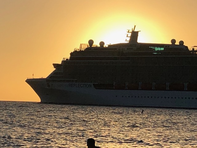 We were there long enough to catch both cruise ships leaving the harbor and heading due south. Here is the first ship as it left.