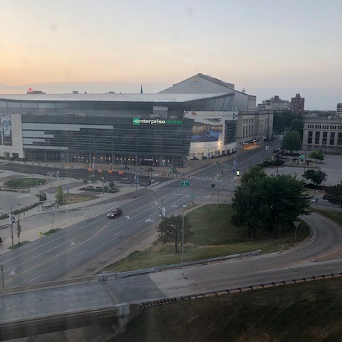 On Friday, June 26, 2020, we left at about 5 pm after both of our work shifts ended. We went straight to St. Louis to our hotel room at the Red Lion in downtown. This hotel was originally booked for a Rage Against the Machine concert that was supposed to be held in May. But the coronavirus, or COVID-19, hit America sometime in March. Soon after that everyone decided to either cancel or postpone their concert tours. We had a few other concerts that we had planned on going to in the summer that were postponed as well. After the postponement, Andrea was given a voucher to use anytime for the same hotel so we decided to use it then. The room was OK and the bed was comfy. There were a plethora of stains on the carpets of the halls and some in the room though. Oh well. It was a room for the night.