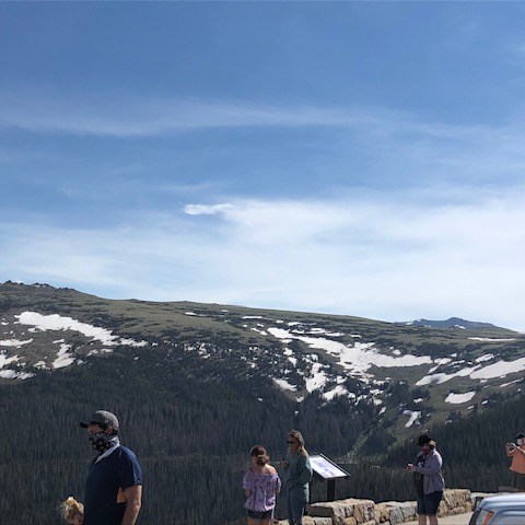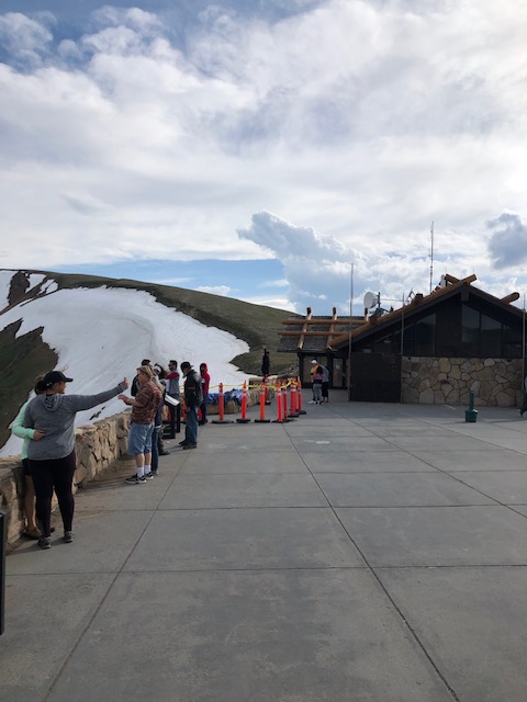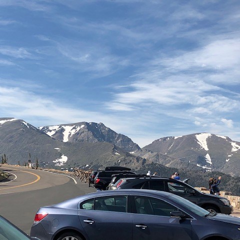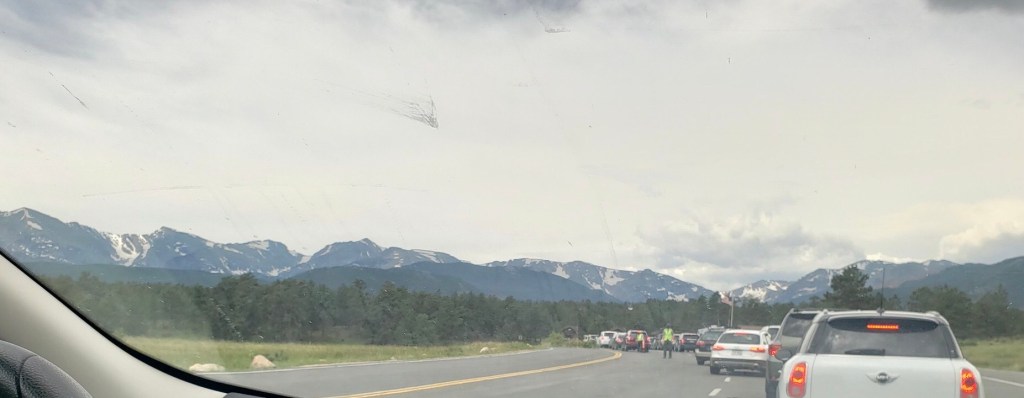 Next, it was a short drive to the Rocky Mountain National Park visitor center where we ate a small lunch from our provisions. By noon we were ready to enter the park with our timed entry ticket. Check out the line to get in!
