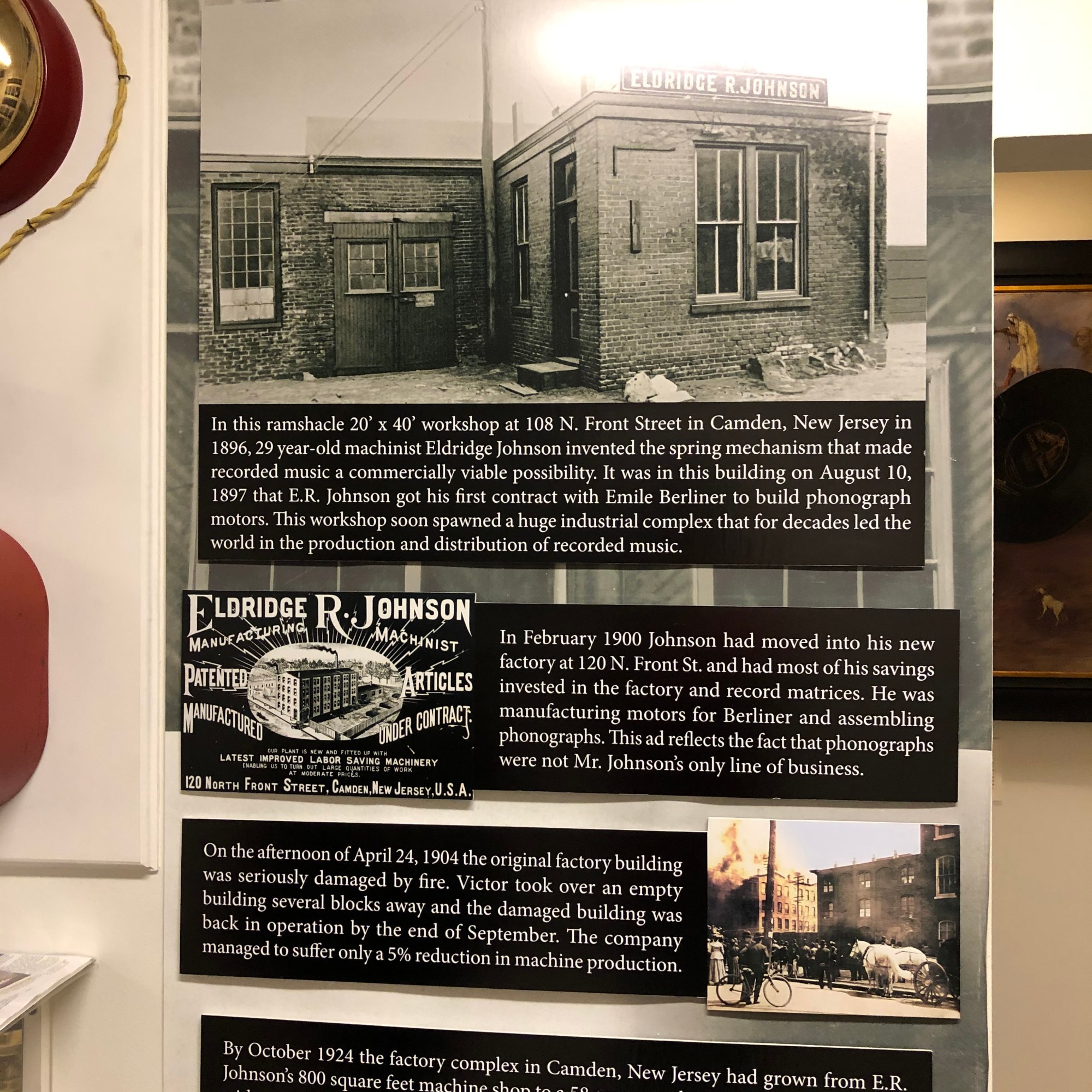 Near there was the Johnson Victrola Museum. The Victrola was a popular horn phonograph record player that was produced starting in 1906. The Victor Talking Machine Company helped make this type of early record player both popular and affordable. The founder of the company lived in Dover for a time which is why the museum is there. You may recognize something in one of the pictures as well, and, yes, this company did later become RCA.