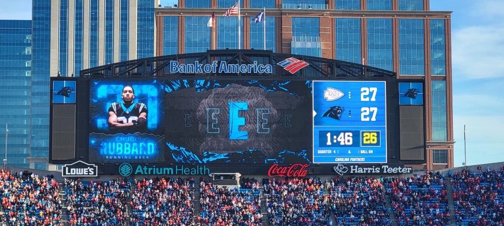 The morning of Sunday, November 24, 2024, I woke up at about 5:30 to get ready for my flight to Charlotte for my first football game at Bank of America Stadium. I’ve been a Panthers fan since the inception of the team in 1995. After 30 years of the team being around it was about time that I saw a game at their stadium and this game against the two-time defending Super Bowl champion Kansas City Chiefs team seemed like a good time to go. After getting to the airport I found some food to eat while walking around to get some steps in. The flight was nonstop to Charlotte with American Airlines, which was nice.